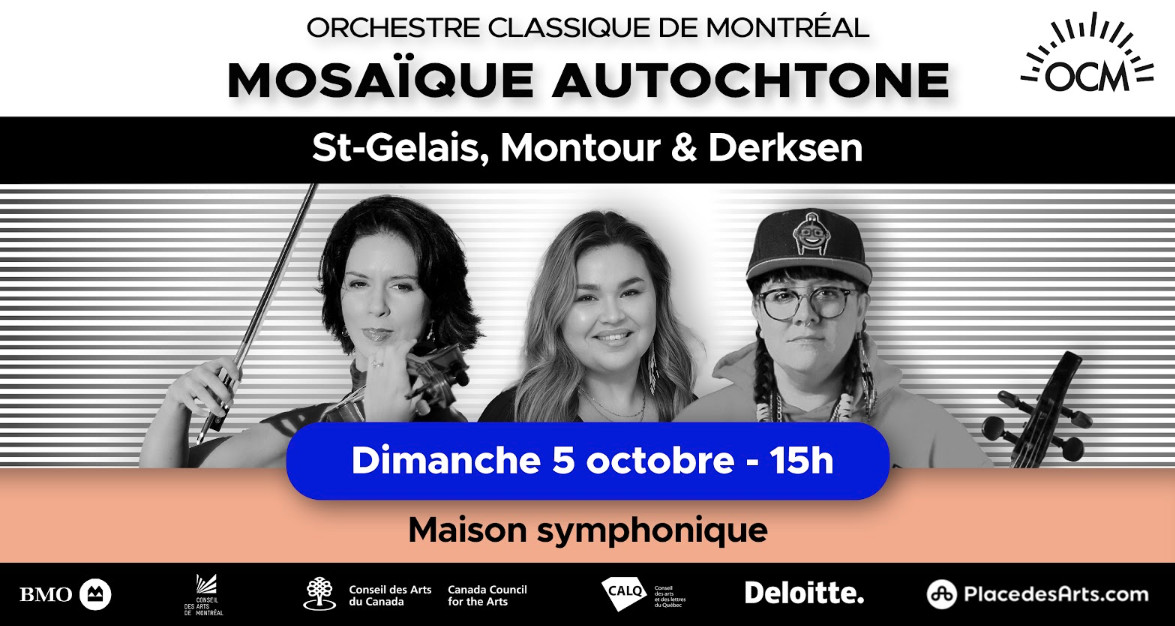 Le concert d’ouverture de la 86e saison de l’OCM, Mosaïque autochtone, mettra en vedette trois solistes exceptionnels : la soprano innue Élisabeth St-Gelais, la violoniste mohawk Tara-Louise Montour et la violoncelliste crie Cris Derksen. Présenté durant la semaine de la Journée nationale de la vérité et de la réconciliation, il réunira des œuvres de compositeurs autochtones et non autochtones. Au programme : la Symphonie « Jupiter » de Mozart, accompagnée des projections visuelles de l’artiste oneida Alanah Jewell Morningstar, la première québécoise de Spider Being de Cris Derksen, des chansons de Tomson Highway et un concerto pour violon de Malcolm Forsyth, commandé par Tara-Louise Montour.