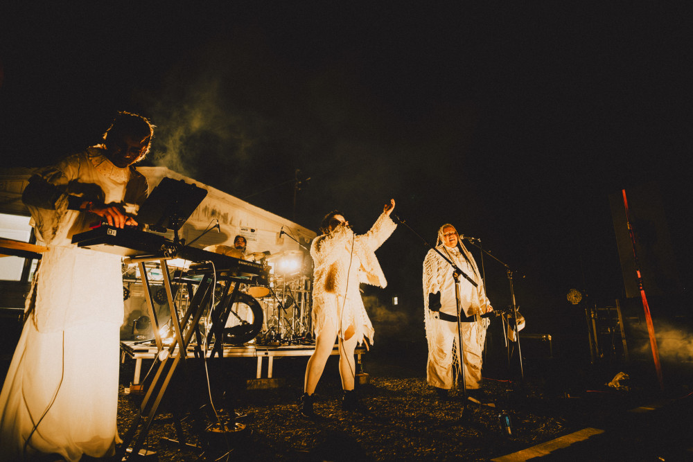 Animée d’une force obscure, l’artiste à la musique pop effrayante est venue interpréter quelques pièces, dont Au nom de la Mère et de la Fille, son seul et unique single disponible à ce jour. Entourée de musiciens, comme Fyore, dont la présence vocale vole parfois la vedette, Gabrielle Audet a mis nos tympans à rude épreuve, instaurant une atmosphère à la fois lugubre et envoûtante. Une prestation ésotérique qui flirtait avec le chaos et une certaine poésie empoisonnée.
