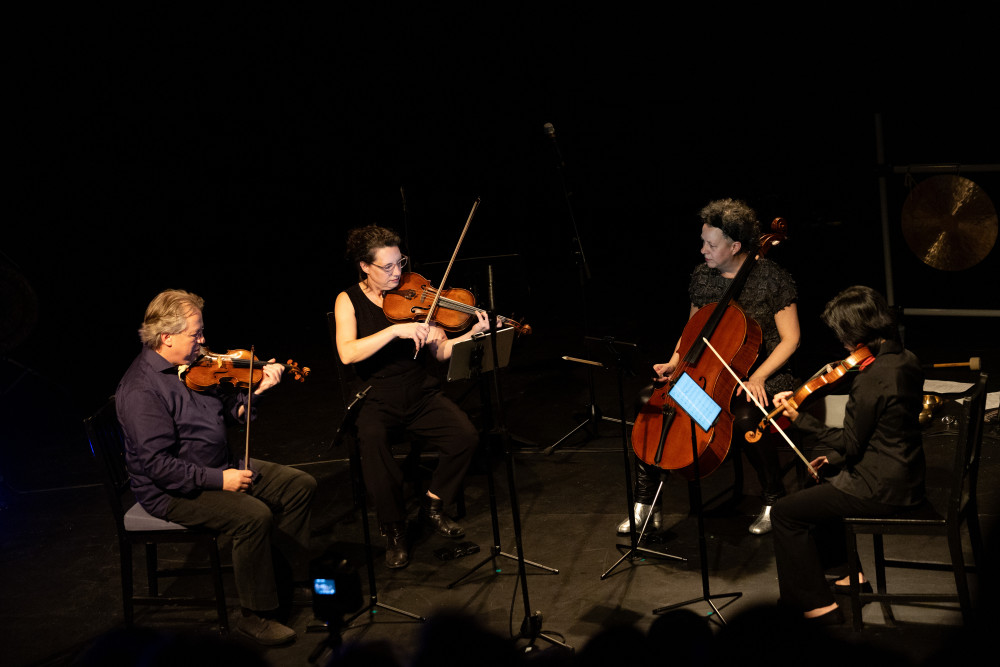 Un troisième spectacle s’amorçait à La Chapelle Scènes Contemporaines. Le Quatuor Bozzini, bonifié de Noam Bierstone (percussions) et Allison Burik (clarinette basse), a intreprété Double Weaving, The Journey of the Horizontal People, ainsi que (Bury Me) Where The Lightning [Will] Never Find Me.