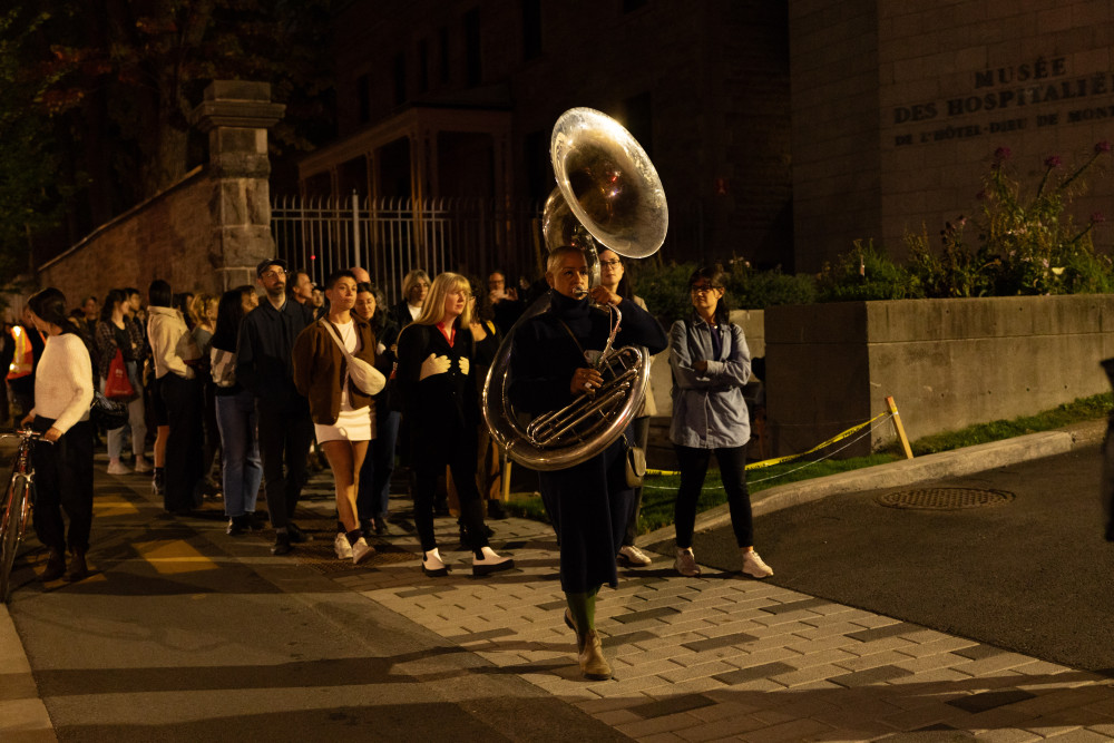 Un déplacement musical avait ensuite lieu sur l’avenue des Pins. La foule était invitée à marcher de la Cité-des-Hospitalières à La Chapelle Scènes Contemporaines, escortée par 8 musiciennes et musiciens.
