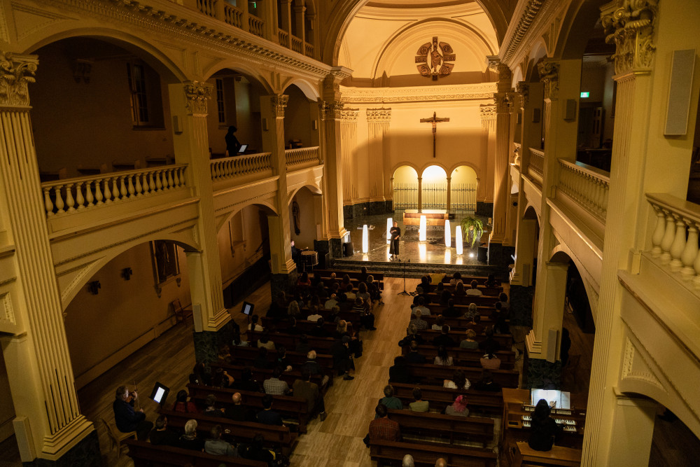 Voiceless Mass a été performée à la Chapelle de la Cité-des-Hospitalières, par une brochette exceptionnelle de musiciennes et musiciens contemporains, incluant le Quatuor Bozzini, dirigés par la cheffe Kim Farris-Manning.