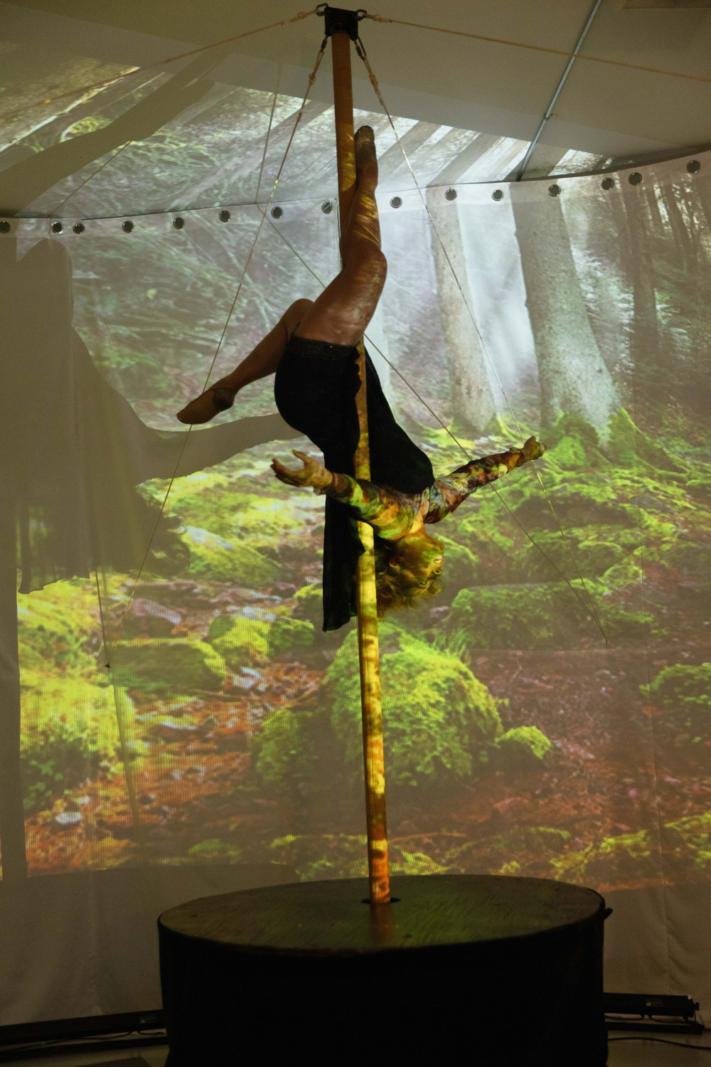 Au cœur de la démarche artistique d’Elsie Morin se trouve son partenaire de scène : le mât rotatif. Cet appareil unique, qu’elle a aidé à développer, est le seul de sa technologie au monde.